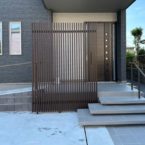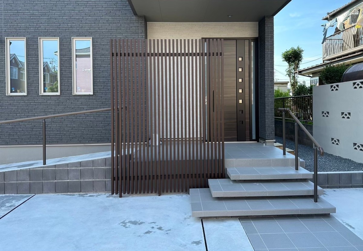 YKK APルシアスウォール×浮き階段のある外構|アドヴァンタイル×千本格子のアプローチ モノトーンでまとめることで、 玄関まわりはすっきりと上品な印象に。 縦格子のスクリーンが視線をやわらかく遮り、 プライバシーにも配慮しています。