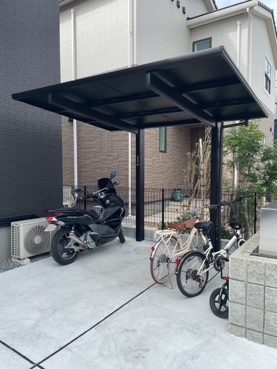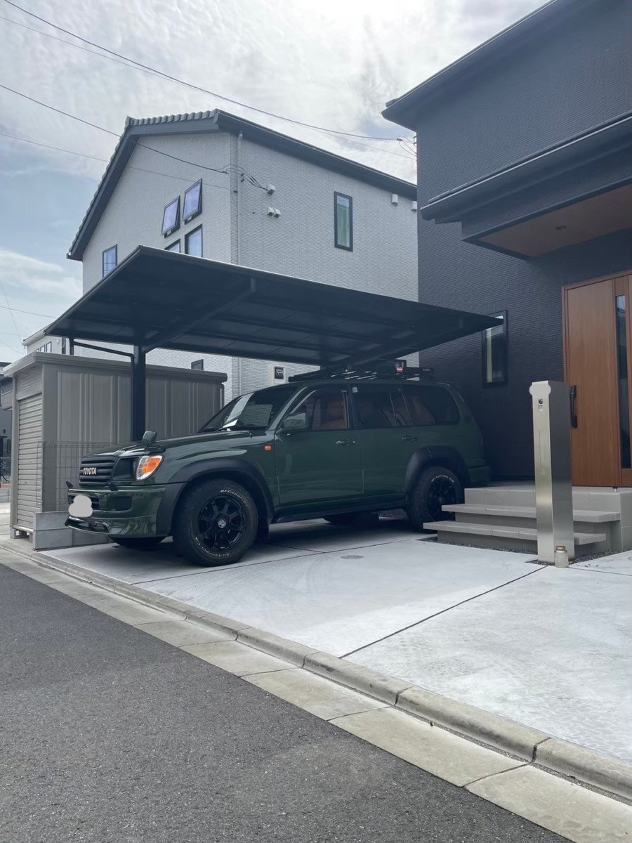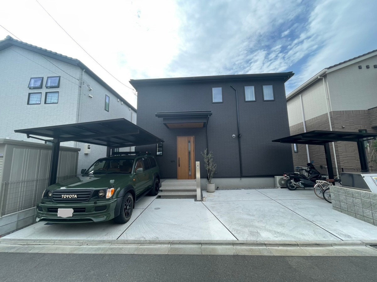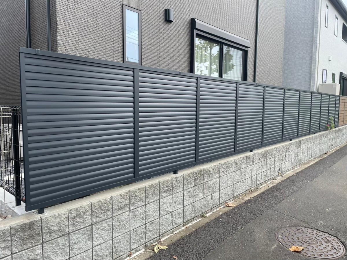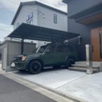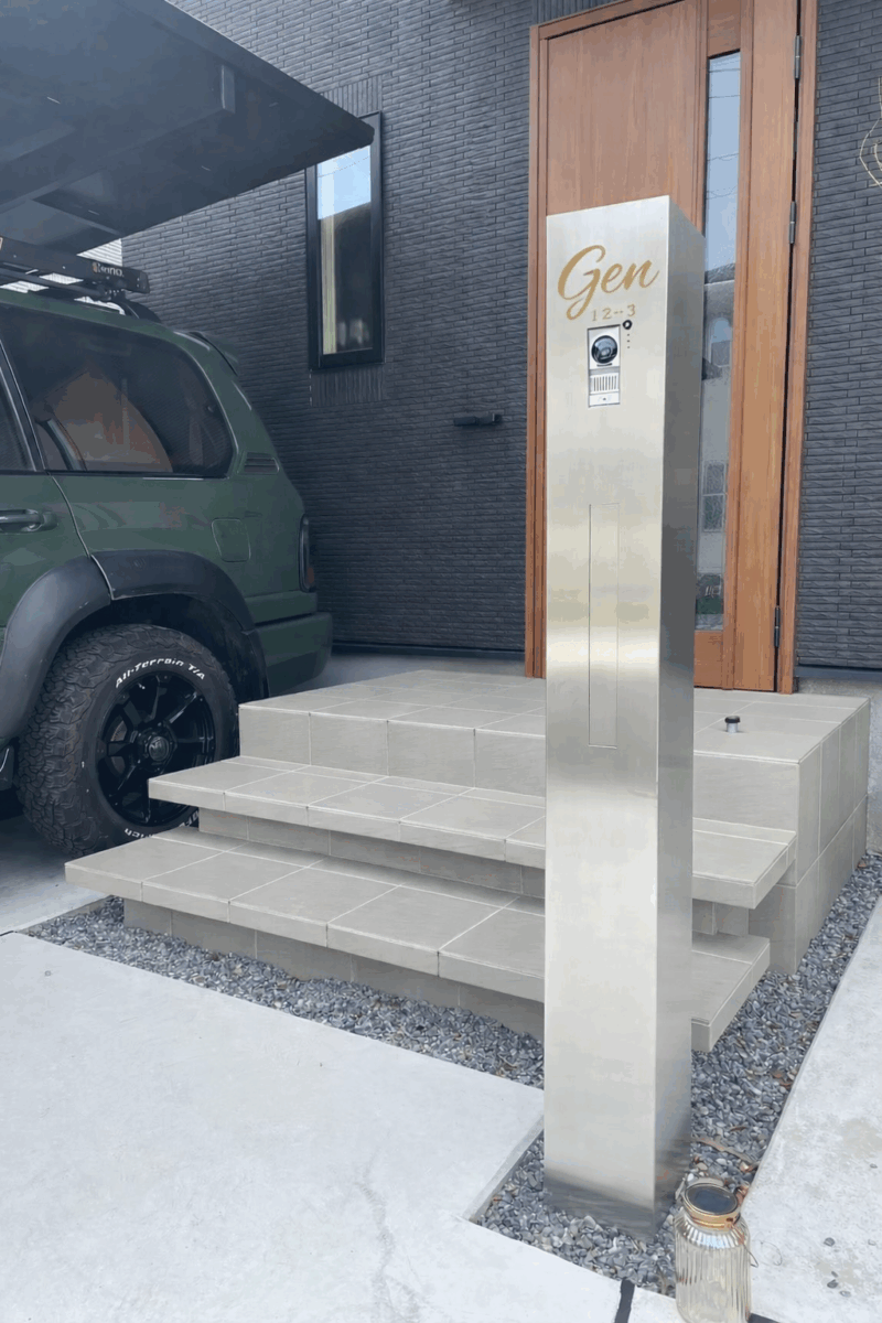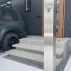 千葉市美浜区にて、新築外構を施工させていただきました。 道路側の目隠しフェンスには、LIXIL フェンスAB YS3型のダスクグレー色を採用。 玄関まわりは、軽やかに見える浮遊階段で上質な印象に。